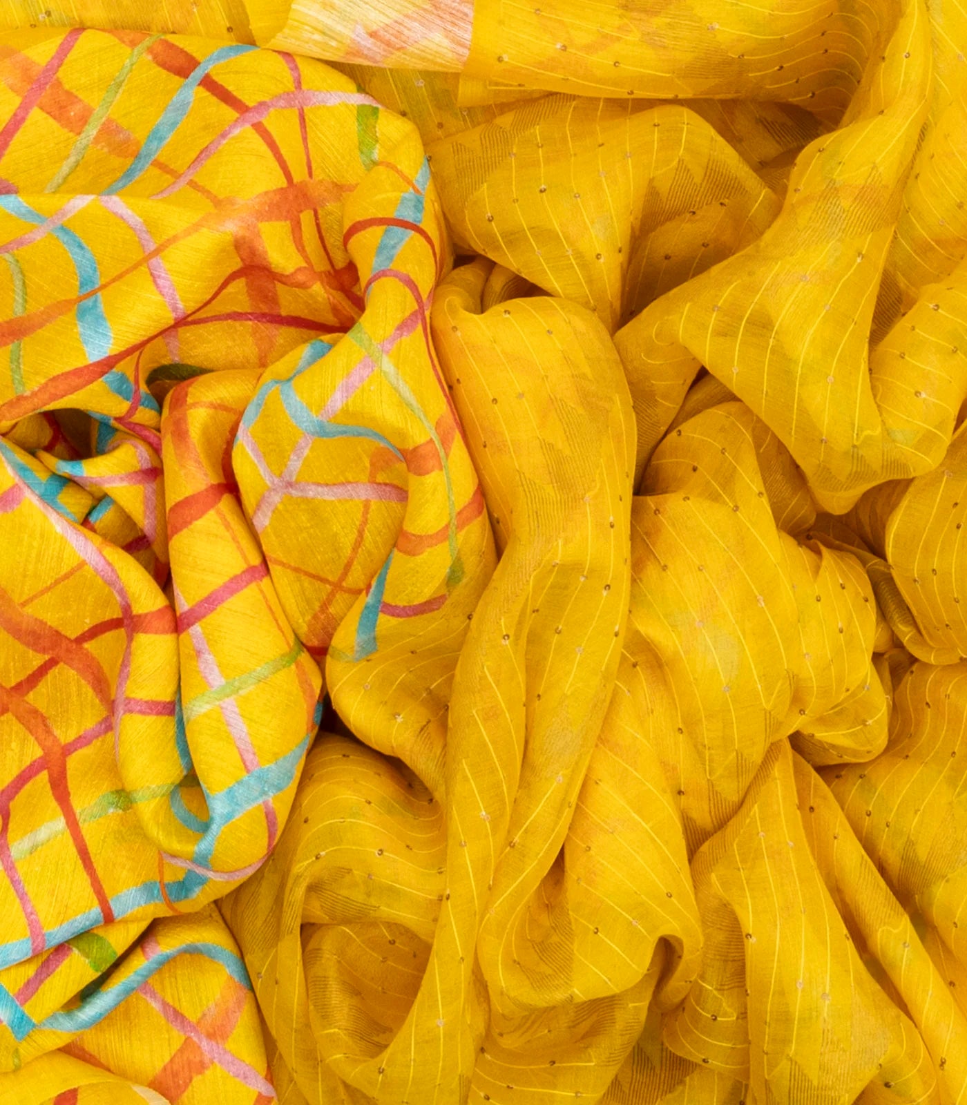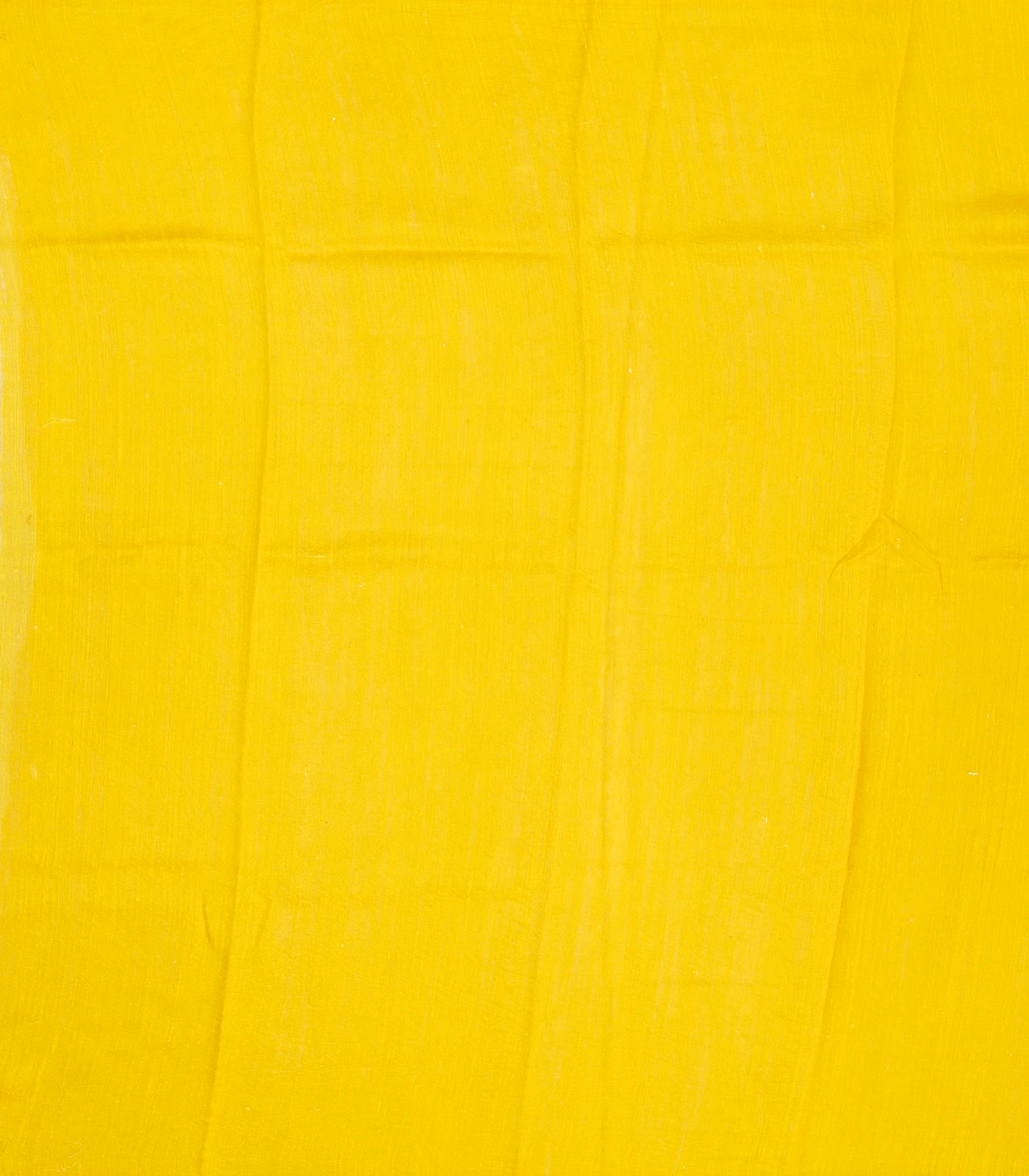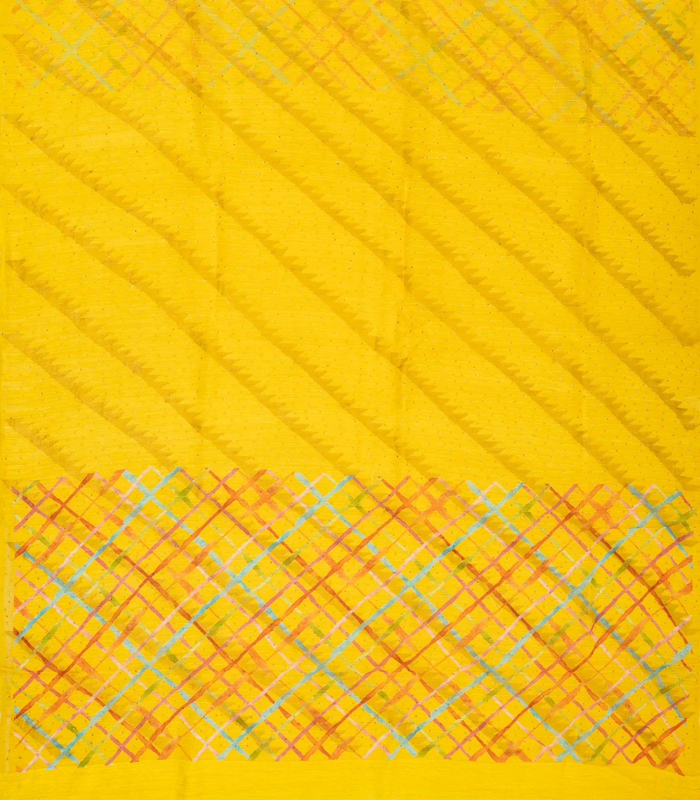 This woven tussar silk saree is filled with printed stripes in yellow body along with zari border and pallu